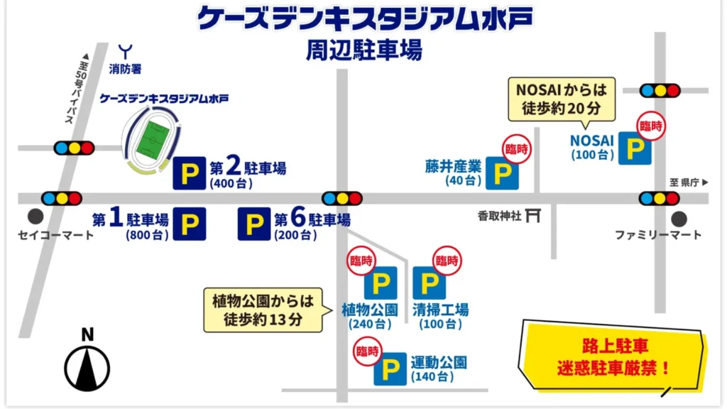 高速道路は、常磐道では水戸IC、北関東自動車道では茨城町西ICが近く、どちらもスタジアムまで10分程度の距離にあります。