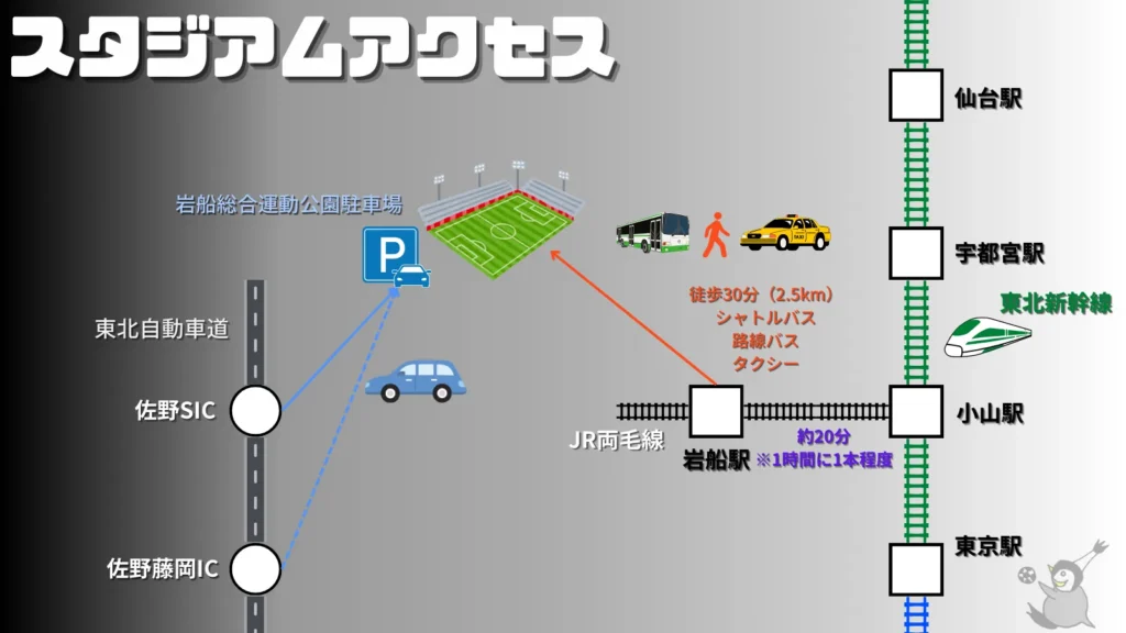 遠方からのサポーターがスタジアムにアクセスするには、まずはスタジアム最寄りの岩船駅(JR両毛線)に向かうことになります。